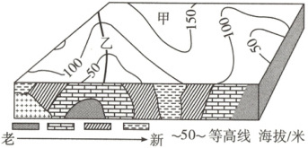 (1)题,根据图中等高线的弯曲特点可以判断出甲处的地形为山地(山脊),结合剖面图可判断出甲处的岩层中间新、两翼老,为向斜构造,因而甲处地貌的形成原因为向斜成山。第