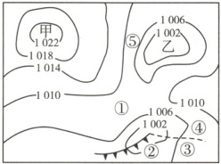 (3)题,图中乙处为低压,根据风向从高压指向低压,北半球向右偏,可知⑤处吹西北风。①处等压线稀疏,⑤处等压线密集,所以①处与⑤处相比,⑤处水平气压梯度力大,风力较大。第