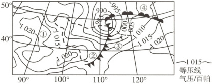 (1)题,锋一般形成于地面气旋的低压槽中。图中气旋东部偏南风来自较低的纬度,气温较高,当它向北移动时,遇到来自较高纬度的冷空气就形成了暖锋(位于③④之间)。第