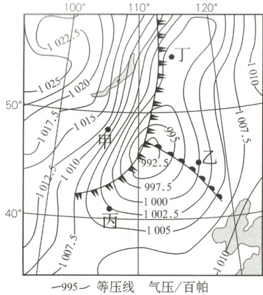 4.C 5.D 解析 第4题,甲地气压为1010百帕,丁地气压为997.5~1000百帕,甲地气压高于丁地,A项错误;乙地等压线比丙地密集,因此乙地风速大于丙地,B项错误;丙地纬度低,受暖气团控制,甲地纬度高,受冷气团控制,气温丙地高于甲地,C项正确;根据等压线分布判断,乙地风向为东南风,丁地为西北风,因此丁地与乙地风向不相同,D项错误。第5题,未来两天,丙地将有冷锋过境,冷锋过境时会出现阴天、大风、下雨、降温天气,过境后气压上升、气温下降、天气转晴。因此气象部门最有可能发布大风预警、低温冻害预警,①④正确。故选D项。