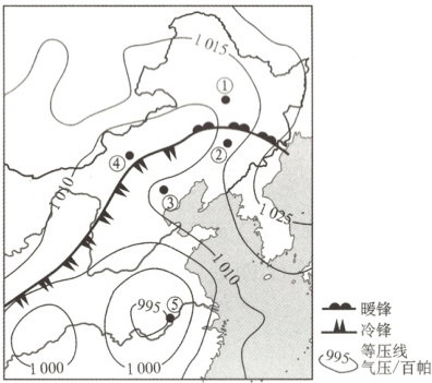 6.D 7.B 解析 第6题,出现阴天、大风、下雨、降温天气是冷锋的天气特征,冷锋降水多位于锋后,读图可知,图中④地位于冷锋锋后,故选D项。第7题,南方⑤地的天气系统是气旋,多阴雨天气;⑤地位于气旋东部,吹东南风。