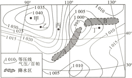 2. 产生图示A区域和B区域降水的天气系统分别是(