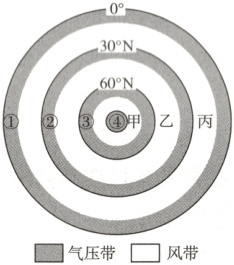 1.D 2.C 3.B 解析 第1题,读图可知,北半球各气压带位置移动到最北位置,因此图示时间是北半球夏季,南半球冬季。第2题,由动力原因形成的气压带有副热带高气压带、副极地低气压带,图中②是副热带高气压带,③是副极地低气压带。第3题,丙地位于北半球的低纬信风带,风向为东北风。