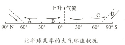 (1)题,从图示看,气压带和风带的位置都在平均位置以南,尤其是赤道低气压带已越过赤道至南半球,可以判断此时为北半球冬季。第