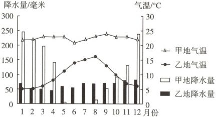 读下面甲、乙两地气温和降水量图,完成5~6题。