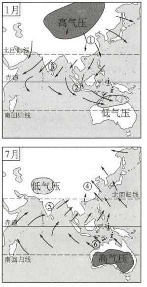(1)东亚地区:1月为西北风,7月为东南风。南亚和中南半岛等地区:1月为东北风,7月为西南风。
