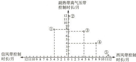 读下面地球上五个不同地区(都位于沿海)受气压带和风带影响的状况图,完成3~4题。