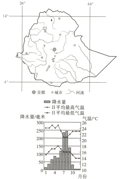 3.D 4.C 解析第3题,根据经纬度可知,图示国家是埃塞俄比亚,该国首都6—9月为大雨季,是北半球夏季,其主要成因是位于西南风迎风坡,D项正确。东北信风来自大陆,降水少,A项错误。不受南半球东南信风影响,B项错误。该地不受赤道低气压带控制,C项错误。第4题,该国首都7月气温日较差小于1月的主要原因是7月雨天多,云量大,①错误,②正确。气温日较差年变化小的主要原因是纬度低,正午太阳高度角年变化小,③正确,④错误。