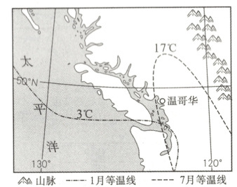 (1)特征:向北凸(弯曲)。原因:西侧海洋7月温度较低;东侧为高大的山脉,海拔高,气温低;海拔较低的温哥华气温较东西两侧高,所以等温线向北凸。