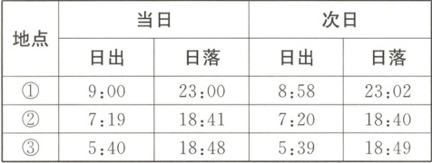解析 从表中数据可以看出,①地昼大于12小时,且昼逐渐变长(当日14小时,次日14小时4分钟);②地昼长小于12小时,且昼逐渐变短(当日11小时22分钟,次日11小时20分钟);③地昼长大于12小时,且昼逐渐变长(当日13小时8分钟,次日13小时10分钟)。第