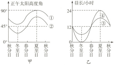1. 图甲和图乙中分别反映纬度较低的两条曲线是(
