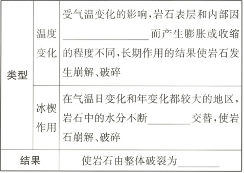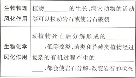 3. 风化作用的结果:使得地壳表层坚硬的岩石变成松散的