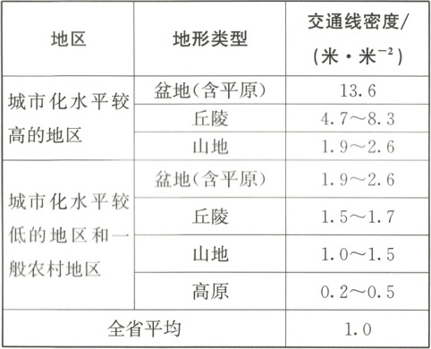 (1)题,由表中数值可以看出,交通线密度最大的地形类型是盆地(含平原)。第