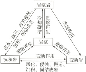 1. 岩石圈物质循环存在的基础:岩石圈中岩浆岩、沉积岩和变质岩的
