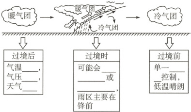 (1)①冷 暖 被迫 ②升高 晴朗 大风、降温、阴雨 锋后 暖气团 晴朗