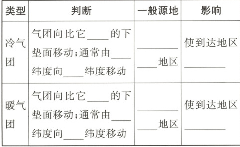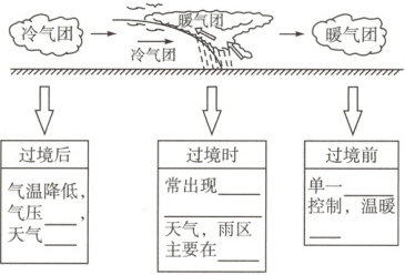 (2)①暖 冷 主动 ②升高 降低 温暖、湿润 连续几天下雨 有雾 冷气团