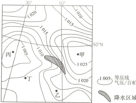 (2)题,甲地为高压中心,受下沉气流控制,天气晴朗,气温日较差大。答案