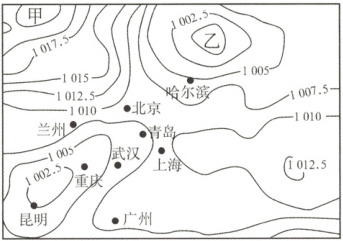 读下面东亚部分地区某时刻近地面等压线(单位:百帕)分布图,完成(1)~(2)题。