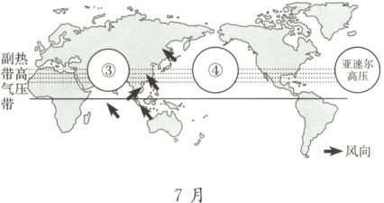 (3)冬季:东亚盛行西北风,南亚盛行东北风;夏季:东亚盛行东南风,南亚盛行西南风。