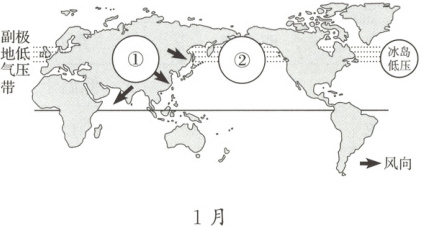 (2)①为蒙古高压,②为阿留申低压,③为印度低压,④为西太平洋副热带高压。