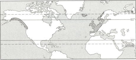 (1)题,图示气候分布在40°N~60°N的大陆西岸,为温带海洋性气候。第