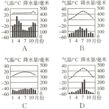 (3)题,A为终年高温多雨的热带雨林气候,B为夏季高温多雨、冬季温和少雨的亚热带季风气候,C为终年温和湿润的温带海洋性气候,D为夏季高温多雨、冬季寒冷干燥的温带季风气候。