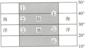 读下面北半球局部地区海陆分布模式图,完成6~7题。