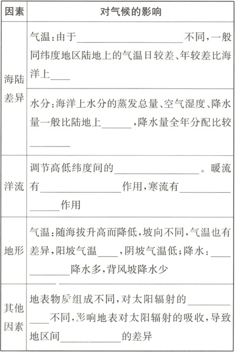 3.海陆热力性质 大 大 均匀 热量和水分 增温增湿 降温减湿 高 迎风坡 反射率 热量状况