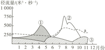读下面我国某地区一条河流受三种不同水体补给而形成的全年流量曲线图,完成(1)~(2)题。