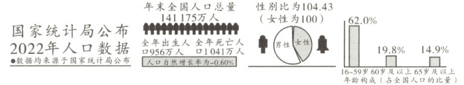 2022年深圳市规定符合条件的生育三孩最多可申请育儿补贴19 000元。山东济南市规定:2023年1月1日以后出生的二孩、三孩家庭,每孩每月可享受600元育儿补贴,直至孩子3周岁。下图为国家统计局发布2022年我国人口的数据图。读图,回答5~6题。
