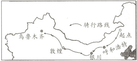 13.B 【解析】骑行队经过的城市中,乌鲁木齐是新疆维吾尔自治区的省级行政中心,呼和浩特是内蒙古自治区的省级行政中心,银川是宁夏回族自治区的省级行政中心,敦煌不是省级行政中心。故选B。