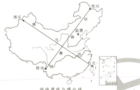 “博台线”与“胡焕庸线”(黑河—腾冲一线)垂直,是中国自然与人文地理要素的渐变线。右图示意两线分布,据此回答11~12题。