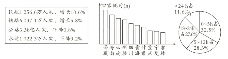 9.C 【解析】民航营运人次增长10.6%,增长率最大,所以营运人次增长率最大的交通运输方式是航空运输。故选C。 10.D 【解析】一般来说,铁路运输速度较快、运量较大,价格较低,运行受气候、地形等自然条件的影响较小,适合运量较大的长途运输。故选D。 11.C 【解析】读图可知,乘火车回家耗时最长的省级行政区是西藏自治区,西藏自治区的行政中心是拉萨。原因是拉萨位于青藏高原,海拔高,距离远。故选C。