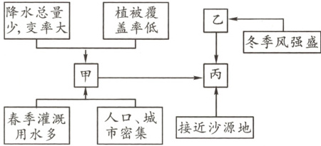8.A 【解析】降水总量少,变率大,人口、城市密集,春季灌溉用水多,植被覆盖率低,会导致干旱灾害,因此甲是春旱;冬季风强盛会引发寒潮灾害,因此乙是寒潮;气候干旱,植被覆盖率低,接近沙源地,寒潮带来大风,会导致沙尘暴,因此丙是沙尘暴。