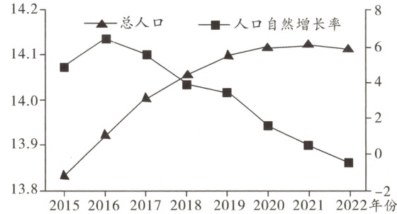 下图示意2015—2022年总人口和人口自然增长率的变化,据此回答17~18题。