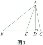 例3 (1)如图1,在$\triangle ABC$中,$\angle C>\angle B,AD\perp BC$于点$D$,$AE$平分$\angle BAC$,你能找出$\angle EAD$与$\angle B,\angle C$之间的数量关系吗?请说明理由。