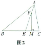 (2)如图2,$AE$平分$\angle BAC$,$F$为$AE$上一点,$FM\perp BC$于点$M$,这时$\angle EFM$与$\angle B,\angle C$之间又有何数量关系?请说明理由。