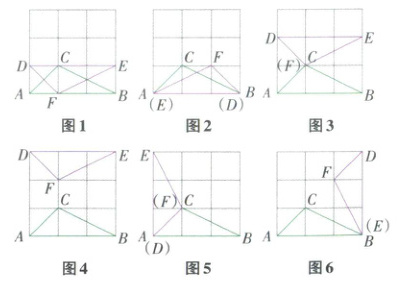 例2 如图,在正方形网格中有格点三角形$ABC$,若三角形$ABC$和三角形$DEF$关于某直线成轴对称,请在给出的图中画出3个这样的格点三角形$DEF$。