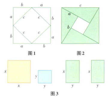 例2 图1中大正方形的面积可表示为$(a + b)^{2}$,也可表示为$c^{2}+4×\frac{1}{2}ab$,即$(a + b)^{2}=c^{2}+4×\frac{1}{2}ab$,由此推出$a^{2}+b^{2}=c^{2}$。