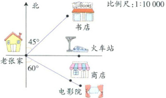 (2)相对于老张家的位置,在南偏东$60^{\circ}$的方向上有商店和电影院。再看比例尺,商店距老张家1.8 cm,换算成实际距离为180 m,所以这处地点是商店。