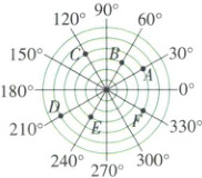 例2 如图是雷达探测到的6个目标,若目标$C$用$(40,120^{\circ})$表示,目标$D$用$(50,210^{\circ})$表示,则$(30,240^{\circ})$表示的是(