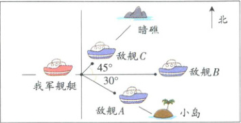 (2)北偏东$45^{\circ}$ 提示:在表示方位时,从南北两侧出发,由图可以看出,敌舰$C$在我军舰艇的北偏东$45^{\circ}$方向上。