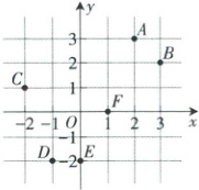 规范解答:点$A$,$B$,$C$,$D$,$E$,$F$的坐标分别是$A(2,3)$,$B(3,2)$,$C(-2,1)$,$D(-1,-2)$,$E(0,-2)$,$F(1,0)$。