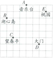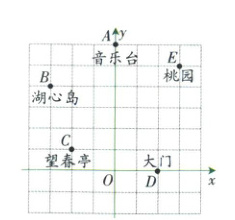 (2)其他景点和设施的坐标分别为$A(0, 6)$,$B(-3, 4)$,$C(-2, 1)$,$E(3, 5)$。