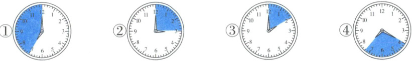 4. 下图中涂色部分是由时针和分针组成的角,比一比,填一填。