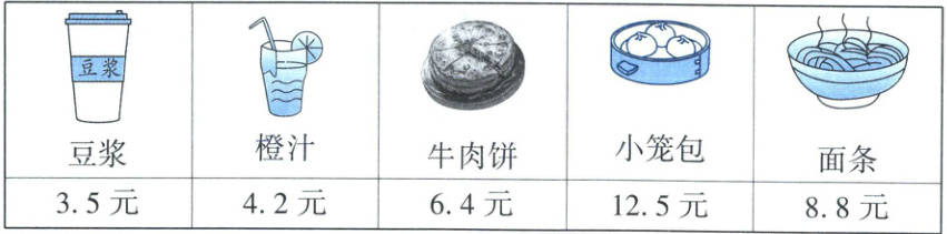 (2)梦梦可以选一杯豆浆、一杯橙汁、一个牛肉饼和一碗面条。(答案不唯一)