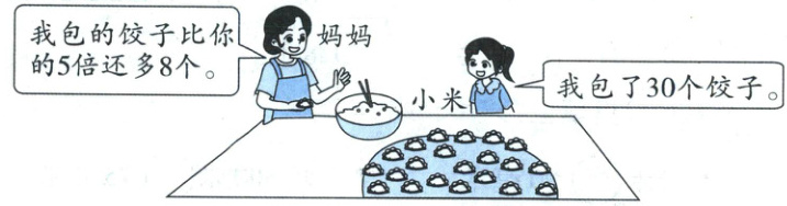 3. 中国民间有“冬至饺子夏至面”的说法。小米和妈妈在冬至这天一起包饺子(如下图),妈妈包了多少个饺子?她们两人一共包了多少个饺子?(4 分)