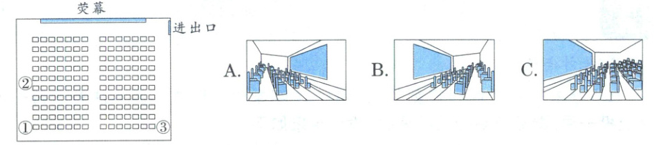 3. 如图是电影院放映厅的平面图,工作人员调试设备时在①②③位置分别拍摄了一张照片,则在①号位置拍摄的照片是(
