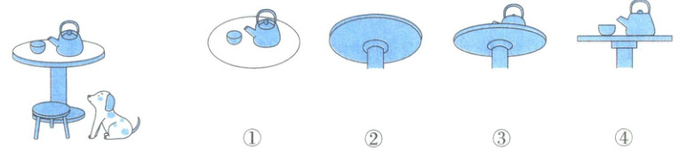 ①小狗站在地面上看;②小狗抬起前腿深长脖子看;③小狗跳到凳子上看;④小狗爬到桌子上看。