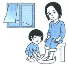 一个小朋友正在给妈妈洗脚。妈妈坐在凳子上,小朋友蹲在妈妈面前,双手放在洗脚盆里给妈妈搓脚。窗外微风拂动,画面充满温馨。以下是写话:
